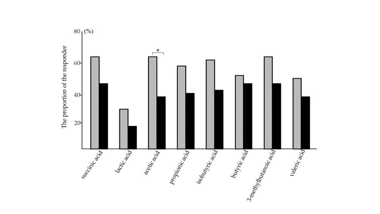 Dla wszystkich SCFA (z wyjątkiem kwasu mrówkowego) odsetek uczestników, u których po zakończeniu stosowania interwencji odnotowano wzrost stężenia (tzw. responders) był wyższy w grupie badanej niż w grupie kontrolnej. Istotną statystycznie różnicę pomiędzy grupami zaobserwowano jedynie w przypadku kwasu octowego.
