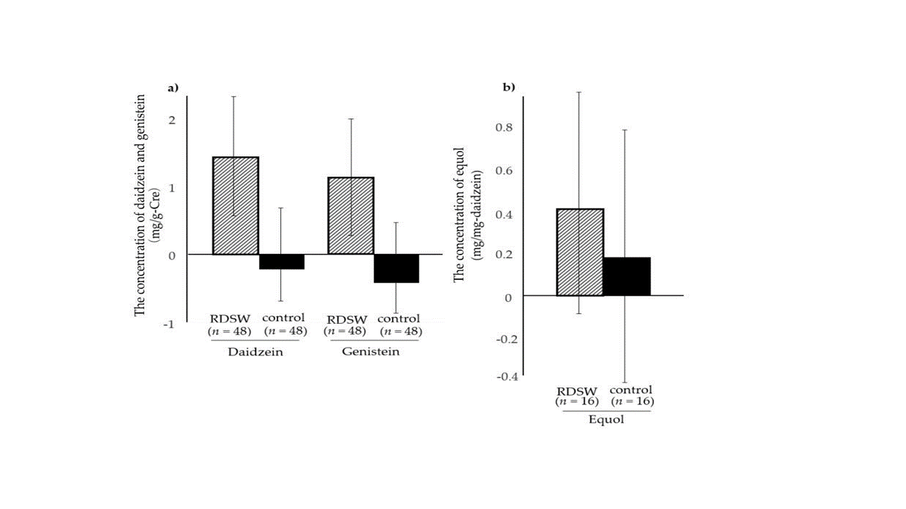 W badaniu Takeuchi i wsp. (2020) wykazano, że stężenia ekwolu w moczu po spożywaniu RDSW uległy zwiększeniu, przy czym zmiana ta była co najmniej dwukrotnie większa niż w grupie kontrolnej. Wzrost stężenia dwóch innych izoflawonów (daidzeiny i genisteiny) zaobserwowano wyłącznie w grupie przyjmującej RDSW, a kierunek tych zmian był zgodny z obserwacjami dotyczącymi ekwolu, choć nie osiągnął istotności statystycznej.
