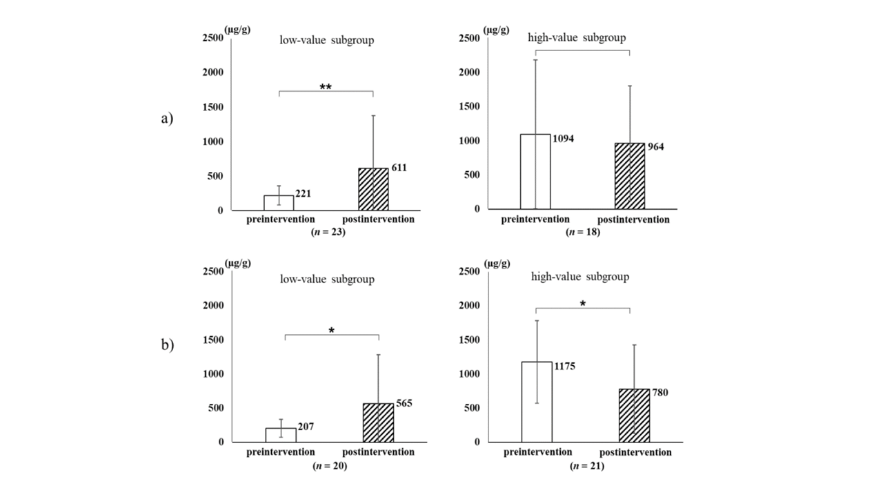 Po zakończeniu przyjmowania interwencji, stężenie sIgA wzrosło w grupie badawczej, natomiast w grupie kontrolnej uległo obniżeniu w porównaniu z wartościami wyjściowymi. W celu oceny trwałego wpływu interwencji na status immunologiczny jelit przeprowadzono szczegółową analizę danych wyjściowych, dzieląc uczestników na dwie podgrupy w zależności od wartości mediany sIgA: niski (<500 µg/g) oraz wysoki (≥500 µg/g). Stężenie sIgA wykazało istotny statystycznie wzrost w obu podgrupach o niskich wartościach wyjściowych. Odwrotną tendencję zaobserwowano w podgrupach o wysokich wartościach wyjściowych: w grupie kontrolnej stężenie sIgA uległo istotnemu obniżeniu, natomiast w grupie badawczej pozostało na zbliżonym poziomie (Rycina 3).