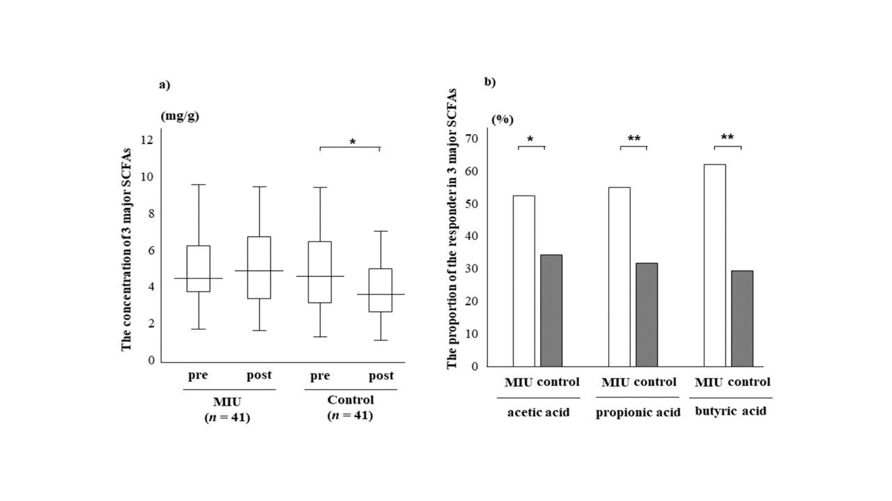 Na podstawie różnic w zmianach stężeń biomarkerów kałowych w przebiegu interwencji przeprowadzono analizę regresji logistycznej wielorakiej w celu oceny zależności pomiędzy rodzajem spożywanej wody a profilami biomarkerów kałowych. Wyniki wykazały, że spożywanie wody pitnej MIU (tj. na bazie głębinowej wody morskiej) miało istotny wpływ jedynie na jeden biomarker — kwas masłowy. Ponadto stwierdzono, że woda MIU wywierała wyraźniejszy wpływ na stężenia trzech głównych krótkołańcuchowych kwasów tłuszczowych (SCFA) w jelicie. Wśród 82 uczestników, kwas mrówkowy wykryto jedynie w niewielkiej liczbie próbek, w zakresie 0,01–0,02 mg/mL (granica detekcji: 0,01 mg/mL), co sugeruje, że w ludzkim jelicie powstają jedynie śladowe ilości tego związku.