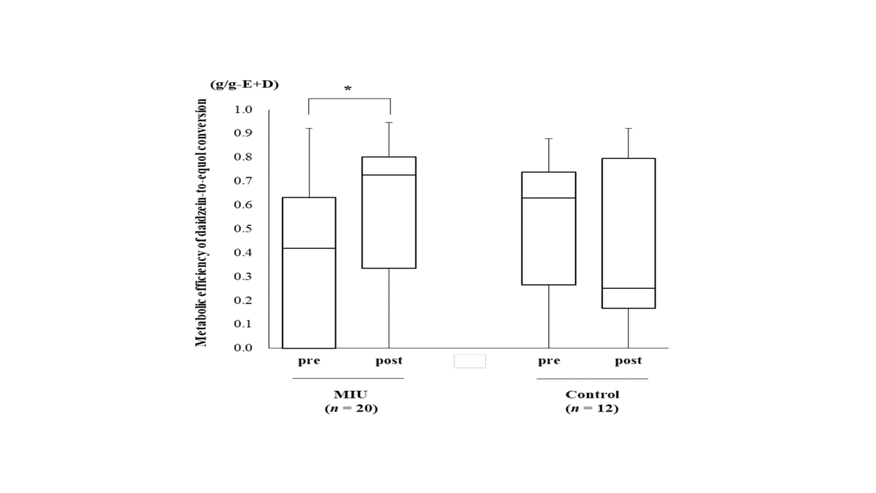 Rycina 5. Zmiana wydajności metabolicznej konwersji daidzeiny do ekwolu po zastosowaniu interwencji (źródło: Takeuchi i wsp., 2022). Górna i dolna krawędź każdego pola oznaczają 25. i 75. percentyl, a linia ciągła w polu oznacza medianę. Wąsy oznaczają wartości minimalne i maksymalne. przed, przed interwencją; po, po interwencji, * p<0,1.