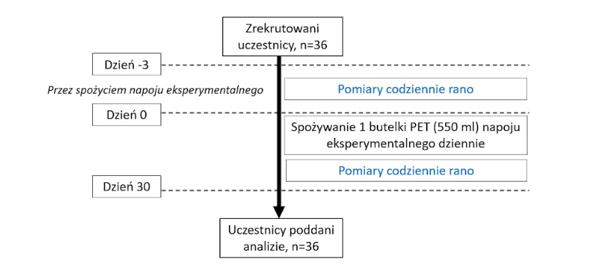 Projekt badania: Przed rozpoczęciem badania każdy uczestnik otrzymał napój eksperymentalny, analizator składu ciała (BC-767, TANITA Corp., Tokio, Japonia) oraz ciśnieniomierz (BP-213, TANITA Corp.). Każdy uczestnik miał wypijać jedną plastikową butelkę (550 ml) napoju eksperymentalnego (wody mineralnej wzbogaconej w minerały pochodzące z głębinowej wody morskiej) dziennie przez 30 dni, z zaznaczeniem, że nie było konieczności spożywania całego napoju za jednym razem i była możliwość picia go w ciągu całego dnia. Aby zweryfikować działanie wzbogaconej wody mineralnej, przez trzy dni przed rozpoczęciem badania, raz dziennie mierzono parametry fizjologiczne uczestników. Aby uzyskać stabilne wartości, każdy pomiar wykonywano w ciągu 30 minut po przebudzeniu i przed zjedzeniem śniadania.